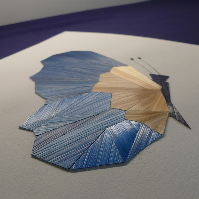 Ce papillon bleu uni est réalisé entièrement à la main en marqueterie de paille. Ses ailes délicatement dessinées révèlent de subtils reflets irisés, grâce à la paille de seigle, matériau naturel et vivant, qui capte la lumière comme la soie. ✨
